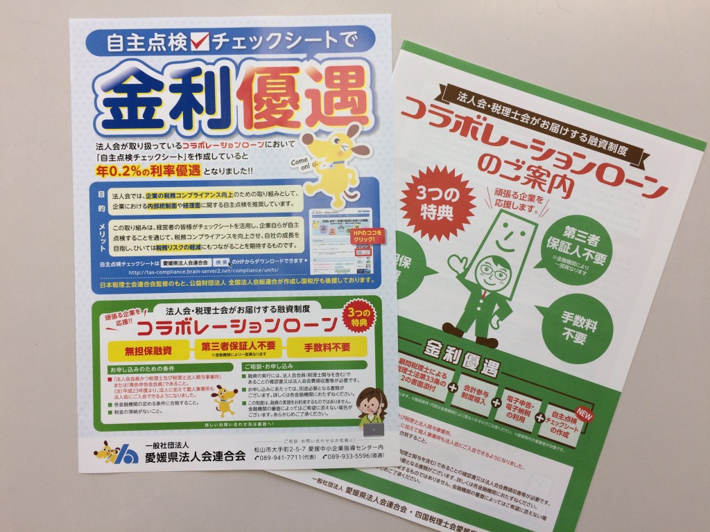 なお、愛媛県連においてこの平成29年度より、「自主点検チェックシート活用企業への優遇金利」制度を県内すべての金融機関・税理士会愛媛県支部のご協力を得て実施している。会員メリットとしてこの融資制度および同チェックシートを引き続き県内全域で普及推進していきたい。