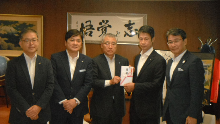 広島県では、広島県連の野坂会長をはじめ、大同生命の小笠原 常務執行役員業務本部長及び大平 中国地区営業本部長・AIG損保の石野 中国・四国地域事業本部長が広島県庁を訪問し、広島県の湯﨑知事に目録を手渡した。湯﨑知事からは「復興のために大切に使わせていただきたい」との感謝の言葉をいただいた。