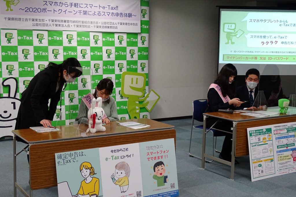 令和2年分確定申告を控え、千葉東税務署の特設会場で、国内屈指の国際貿易港・千葉港の親善大使として活躍する“ポートクイーン千葉”の皆さんが、スマホ申告体験を通して、新型コロナウイルス感染症拡大防止のためにも、税務署の混雑を避けて、自宅からスマホやパソコンを利用した電子申告e-Taxの利用促進をPRしました。このイベントは千葉東税務署と千葉東法人会をはじめとする税務協力6団体が税のパブリシティ活動としてマスコミ各社のご協力のもと取り組んだものです。 (令和2年12月10日 掲載)