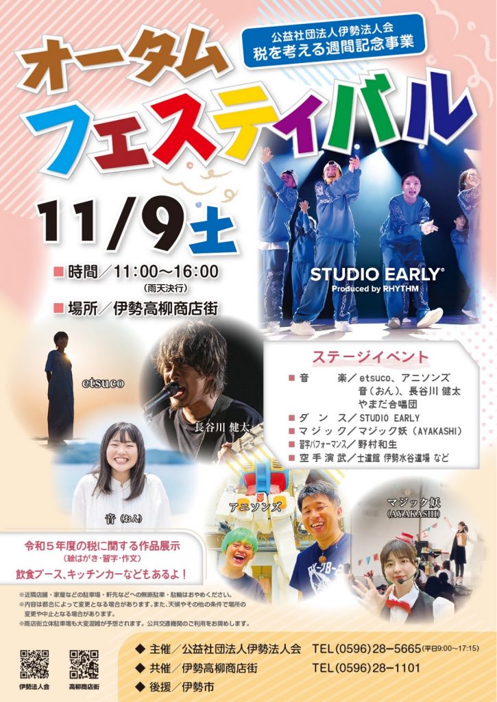 伊勢法人会(会長 村田典子)では、令和2年からコロナ感染症が蔓延したことで税を考える週間記念事業の見直しを図り、地域住民に対して伊勢法人会として何ができるのかを考えた結果、令和6年度は初の試みとして、伊勢高柳商店街にてキッズダンス、地元出身のアーティスト、空手家、合唱団、書道家、マジシャンなどを招いてのステージイベントとキッチンカーや飲食店に出店いただき、来場者に食事を振舞うイベントを11月9日(土)にオータムフェスティバルと題して開催しました。