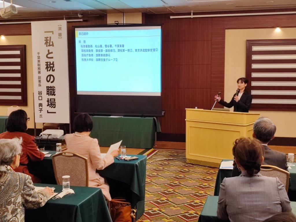 定時総会に先立って開催された税務研修会では、千葉東税務署の谷口典子副署長に『私と税の職場』をテーマにご講演をいただきました。ご自身のご経歴のなかから、国税庁国際業務課に配属されていた際の、各国税務当局との研修を通じた交流などについてもお話しいただき、税務行政について理解を一層深めることとなり、参加者にとって大変有意義な研修会となりました。