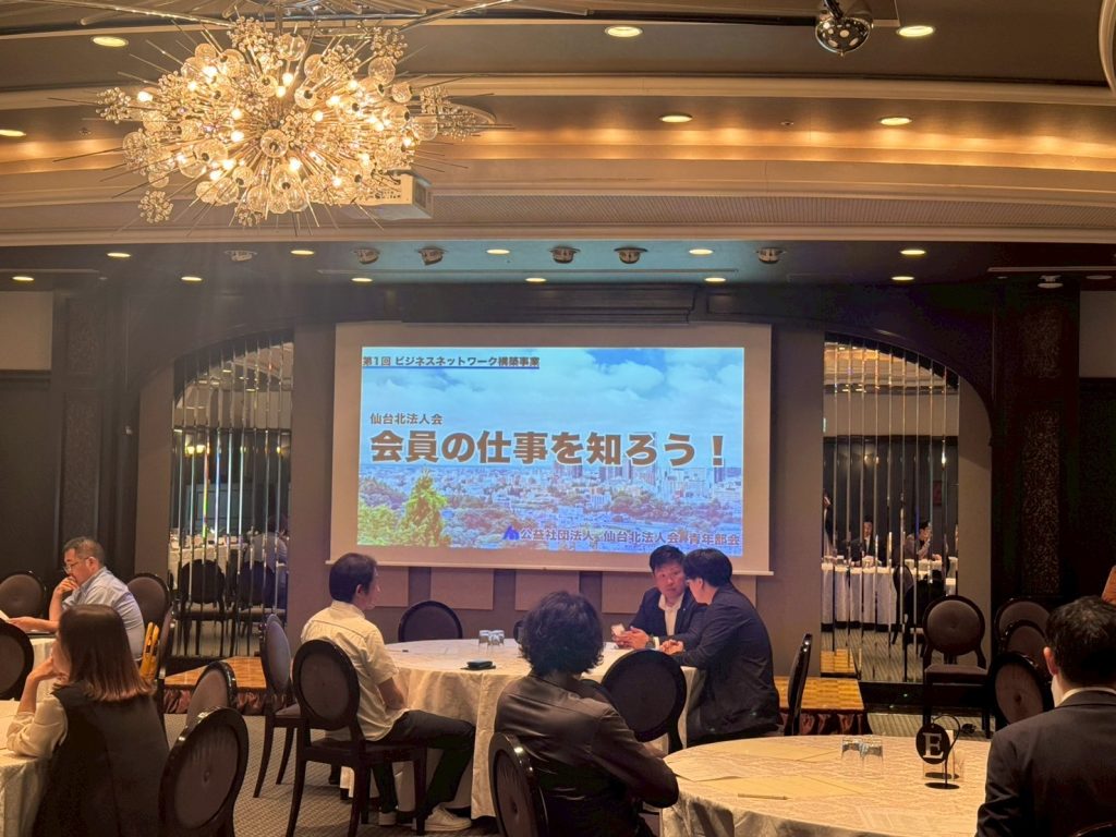 青年部会(髙橋繁紀部会長)では、去る6月17日(火)18:00~「パレスへいあん」にて、「部会員間の人脈を広げる」をテーマに当仙台北法人会青年部会員間でのビジネス交流事業を参加者40名で実施しました。はじめに、令和6年度入会の新入部会員の紹介をし、各テーブルでは部会員の自社事業の「伸ばしたい!試したい!解決したい!」事柄を発表し、互いのビジネス発展を模索しました。懇親会では、会社経営者ならではの悩みを発表し参加者全員で解決に向けて話し合いました。今後も活発な部会員間のビジネス交流実現に向けて活動していきたいと考えております。