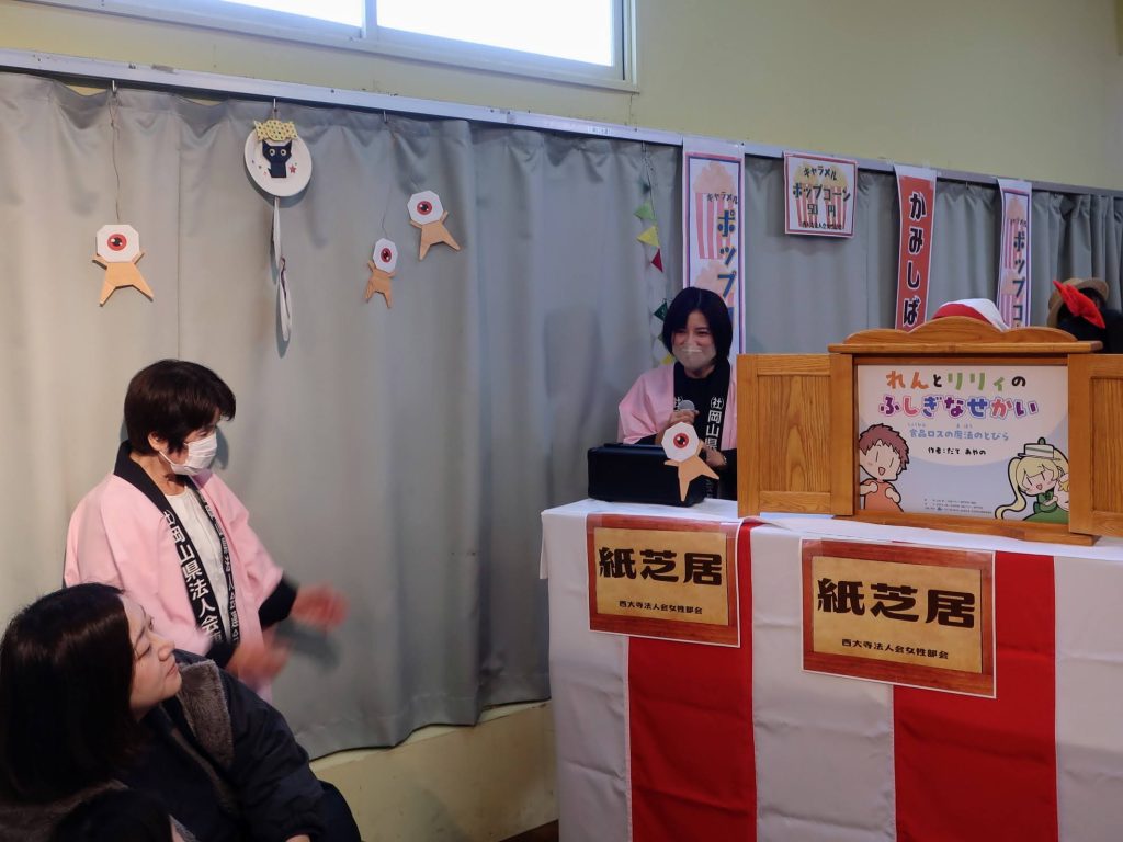 女性部会は、地域連携ボランティア活動の一環として、西大寺高校の生徒たちとともに参加。今回の読み聞かせでは、税金の大切さを伝える『カッパのいたずら』に加え、食品ロス問題をテーマにした新作紙芝居『れんとリリィのふしぎなせかい』を初上演。