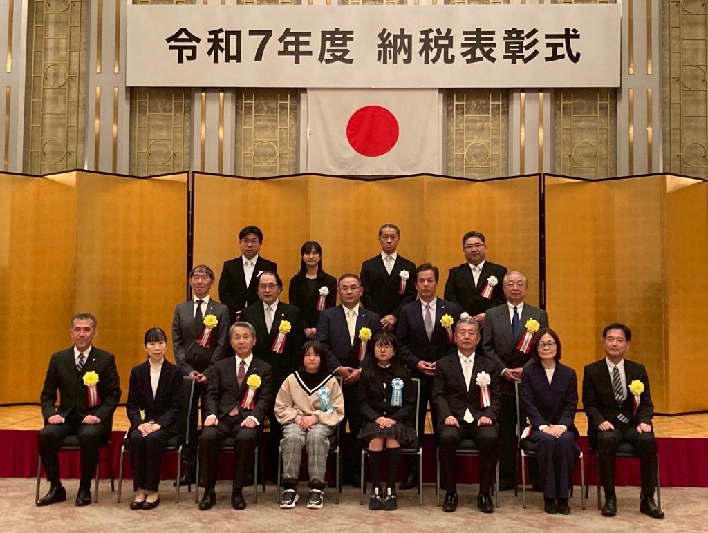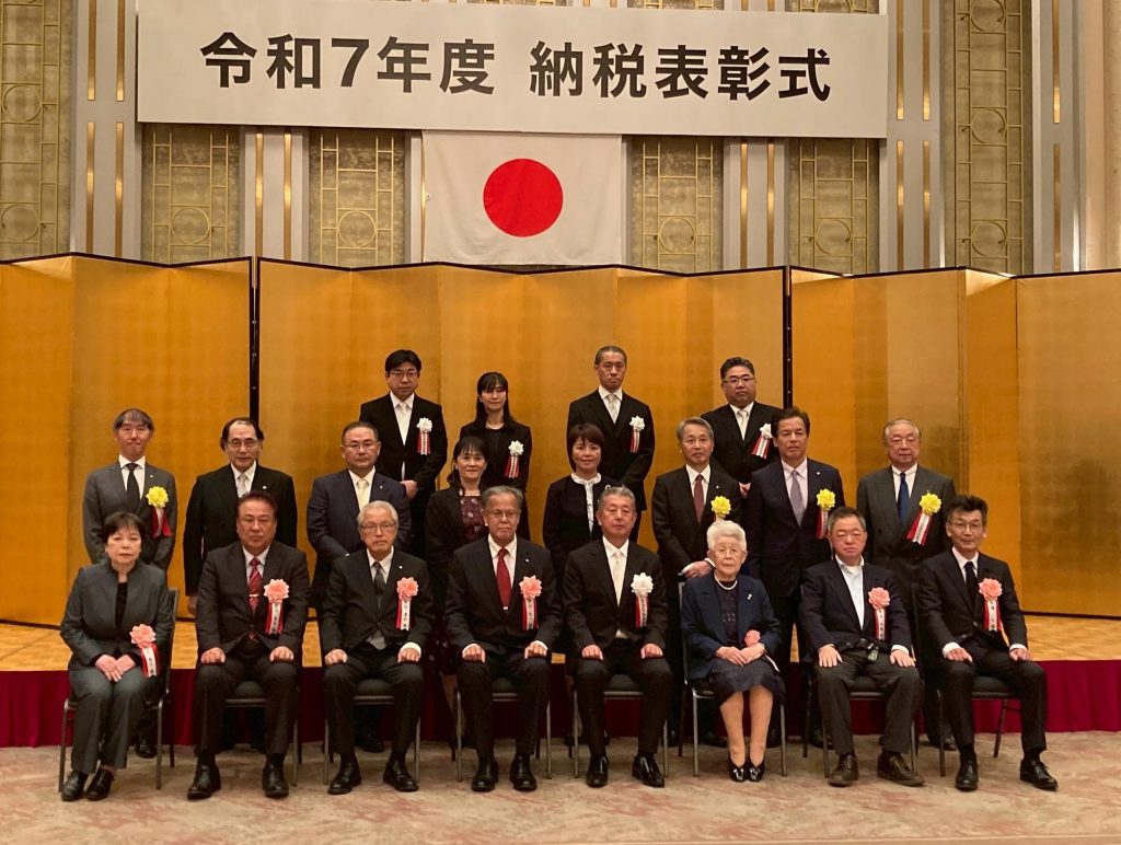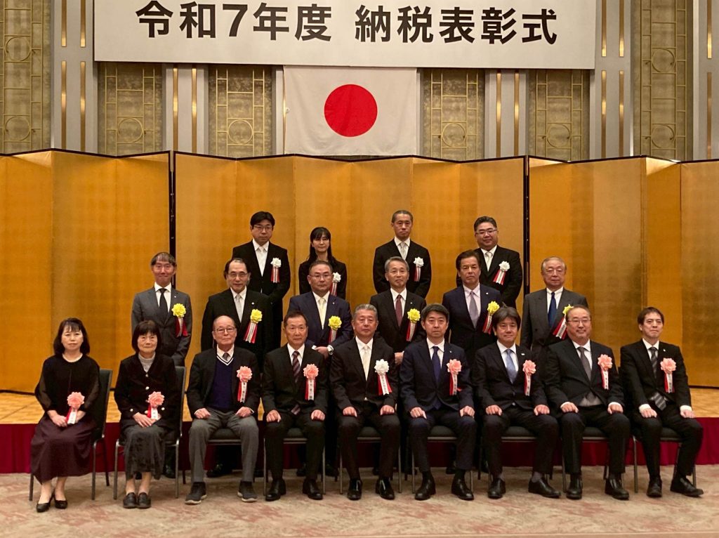 11月11日(火)、千葉市内ホテルにおいて千葉東税務署令和7年度納税表彰式が挙行され、千葉東法人会の役員を含め、申告納税制度や租税教育等に関して功績顕著な17名と2団体が表彰を受けました。