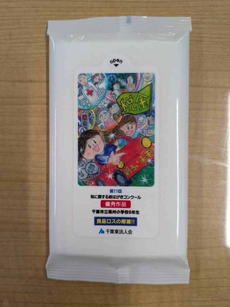 千葉東法人会では、「税に関する絵はがきコンクール」で千葉県連女性連協会長賞を受彰した優秀作品をシール面にデザインした除菌ウェットティッシュを毎年度製作し、広く税の広報活動に役立てています。