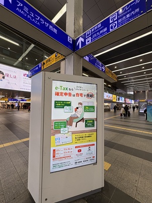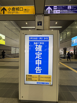 令和7年度は従来の確定申告PR方法を改め、先般ご案内のよう小倉税務署の皆さまとJR小倉駅開催「エキナカ学園祭」へ参加、更には「広報車」での巡回案内を取り止めて、JR小倉駅・北九州モノレール小倉駅前の「デジタルサイネージ」を活用したご案内へと見直しを図った。