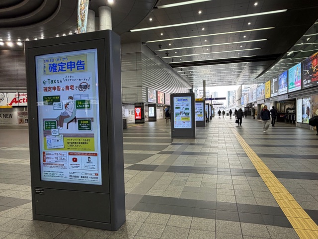 2/1からはKデジタルサイネージで1カ月間、2/16からはストリートサイネージで2週間、小倉税務署原案ご提供の広告を掲出する。この見直しにより、従来以上に多くの市民の皆さまへ確定申告のご案内が届く機会を創出できたものと自負しているとのこと。